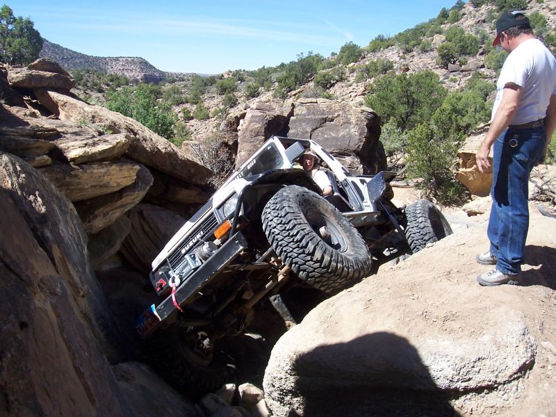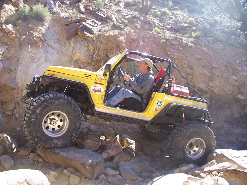 So, the day starts out kinda crappy. I told Dave that I'd meet them at the highway turn off to the trail due to my Stupid Swampers being, well, not exactly street worthy. I had to pump up the tires at the Shell station to about 28 psi. Met the group at the turn off and we headed to the trail. Awesome trail in the bottom of a wash. Boulders about the size of pumpkins on up. Wherever you go in the wash you can be rolling rocks underneath your tires. Good thing for the Jeep and larger boulders you can get a little traction on. :D